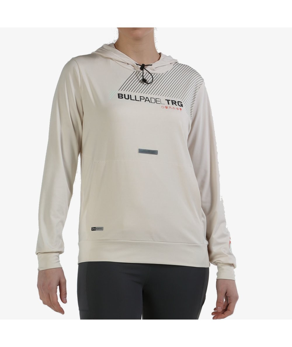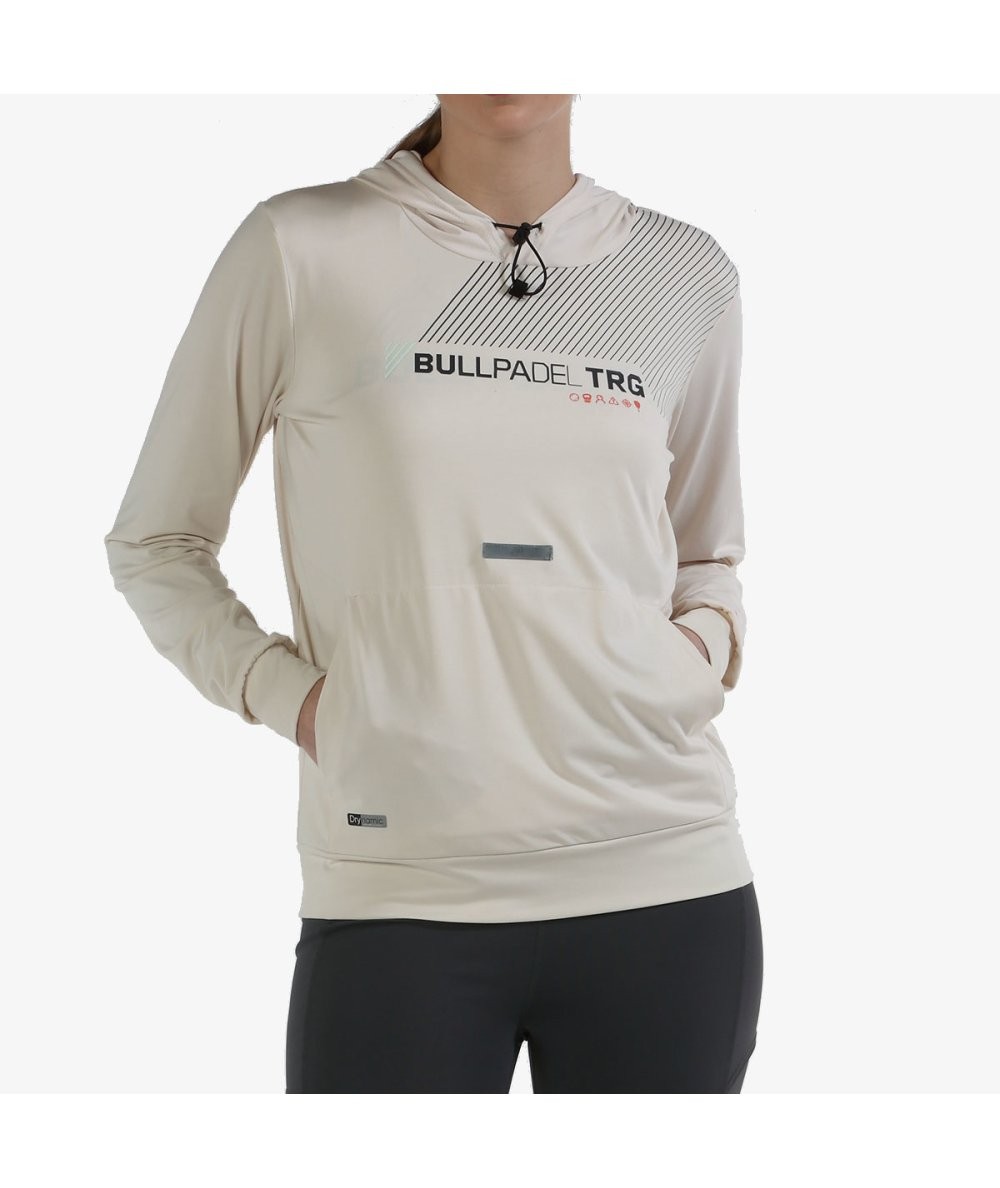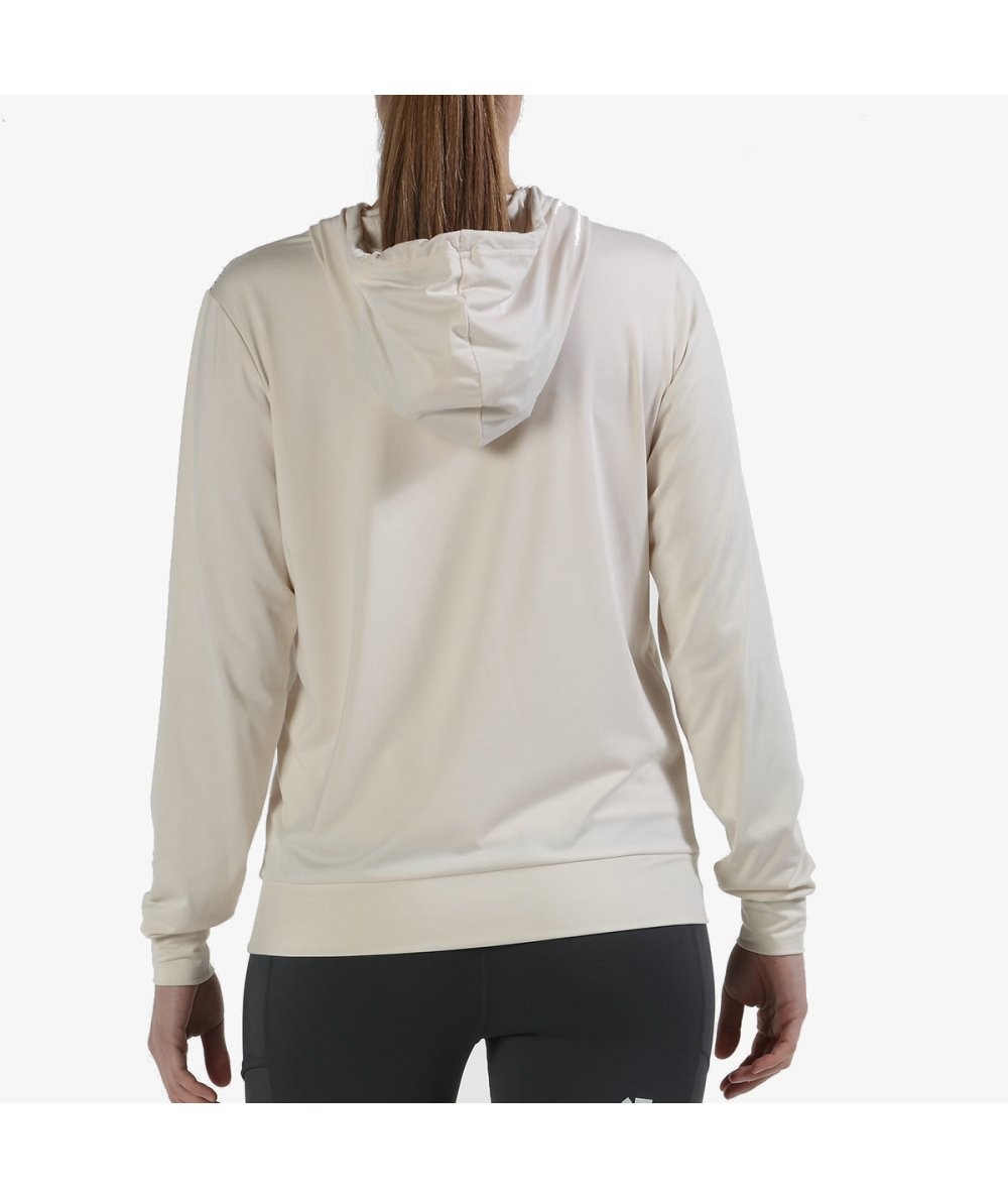 Sudadera marfil de nuestra línea de entrenamiento cerrada, con capucha, bolsillo de tipo canguro y gráfico en el pecho.